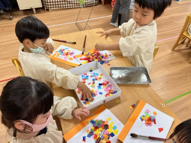 水溶きのりをつけた上にふりかけパラパラ〜 目としっぽをつけて完成!