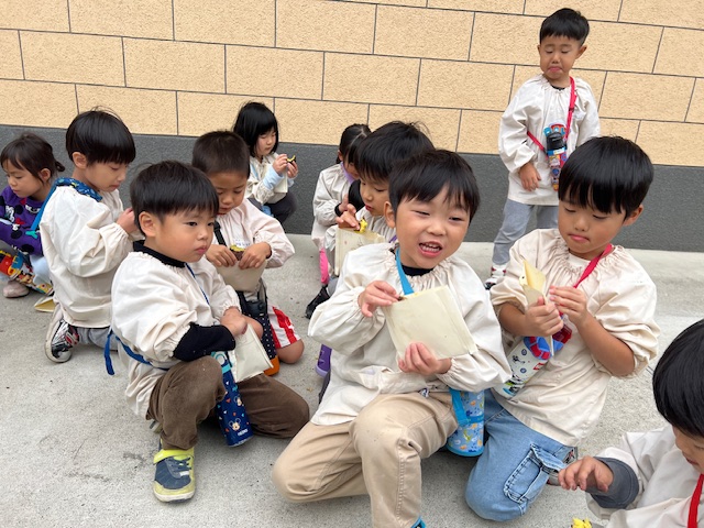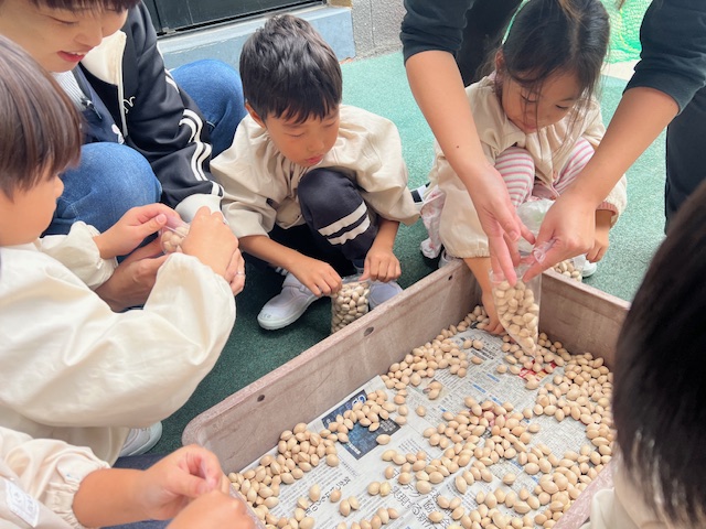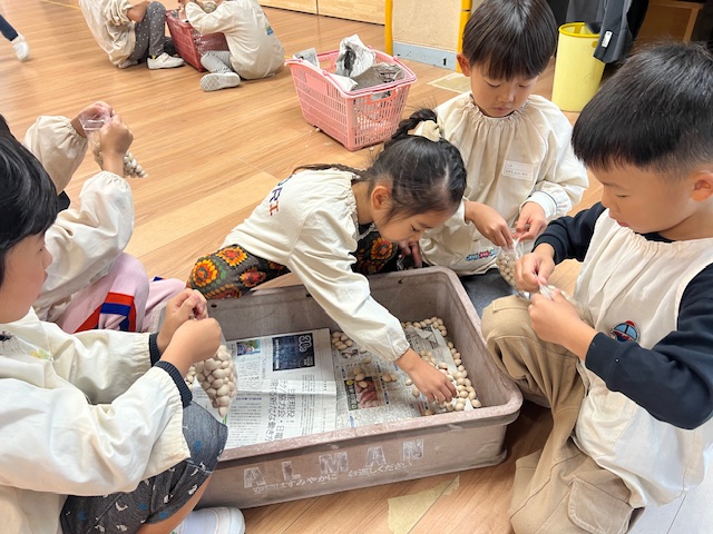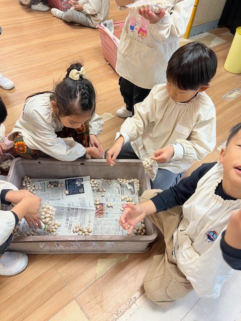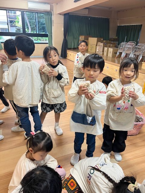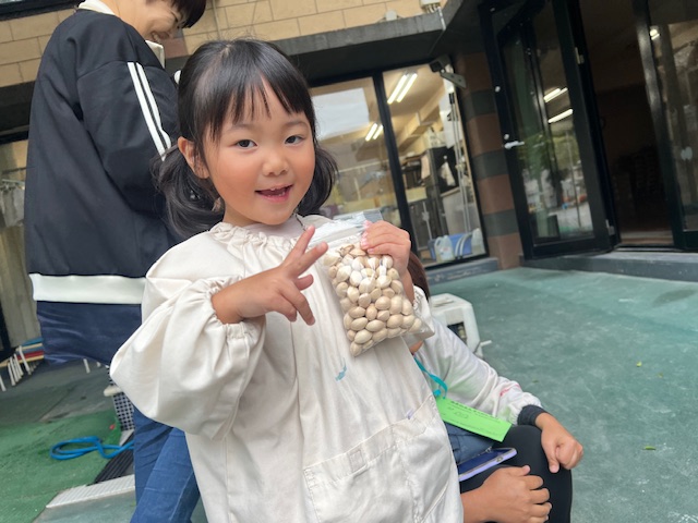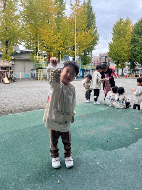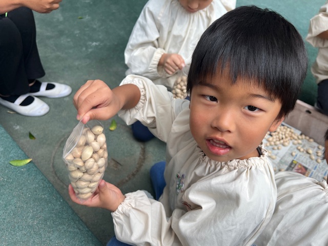 イチョウの葉の中から実を取り出して洗って種を取り出して乾燥させて…中々の匂いの中で作業でやってくださり出来上がった銀杏。 皆さんにもお裾分け。 ビニールだけ渡して好きな様に入れてもらいました。 閉まらないほどパンパンに入れる子、数粒でもういいと言う子、入れ方は様々でした^_^ まだある様ですのでご近所、おじいちゃんおばあちゃんに差し上げたい方は是非! しかし食べ過ぎ中毒に注意です。