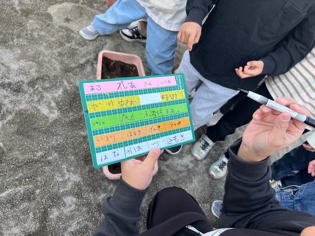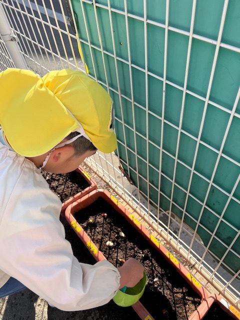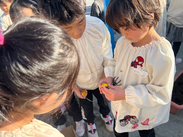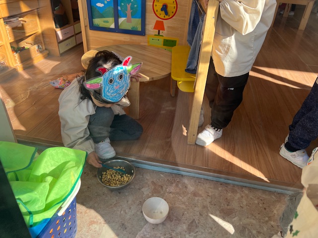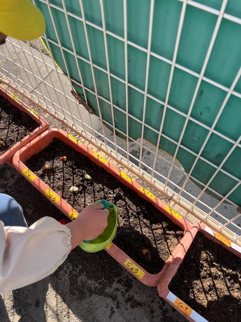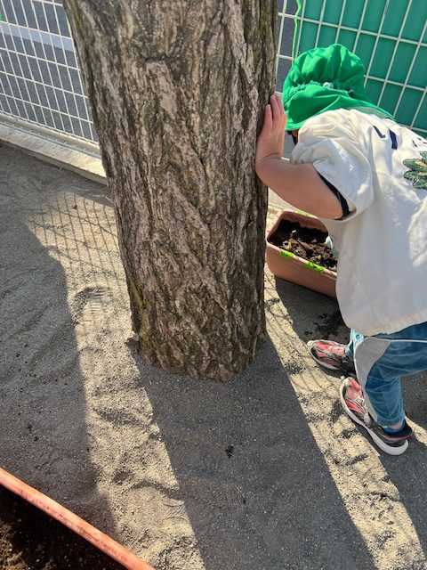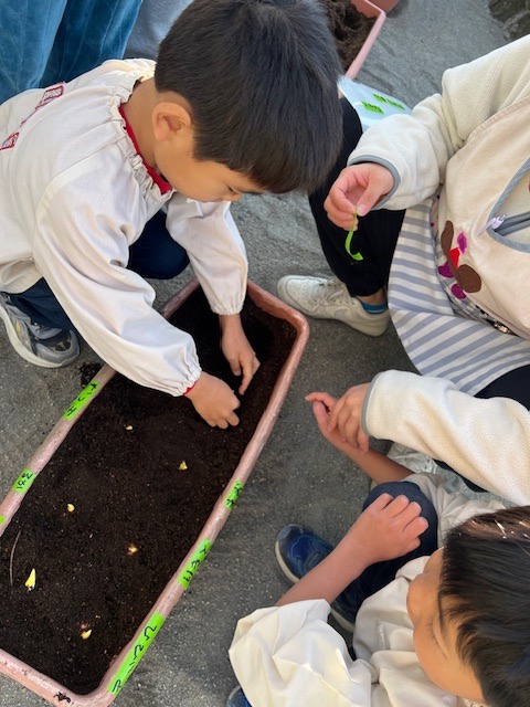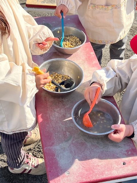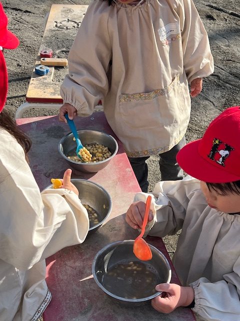 節分で園庭に撒いたお豆。 撒いた時はまん丸の形だったのに雨で湿った園庭で次第に大豆の形に… に気付く子どもたち。 ならばとお水に浸して形の変化や柔らかさを楽しんでいます。 これが明日香味噌作りに繋がるね。