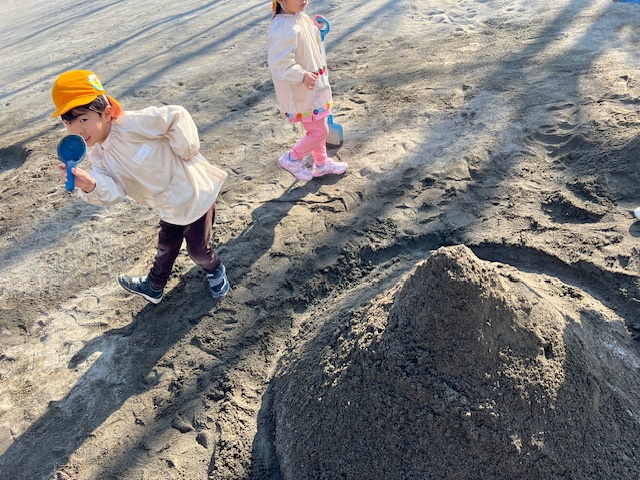 ひたすら何日もかけて「こわさないで」の表示も貼りながら作り上げた砂山の前でポーズ