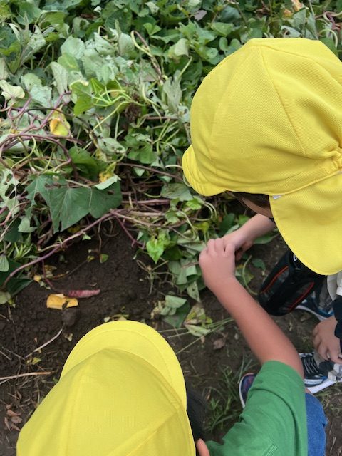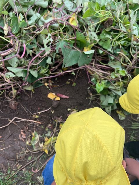 来週の芋掘りに向けてお芋の成長を畑に見に行った年長組。