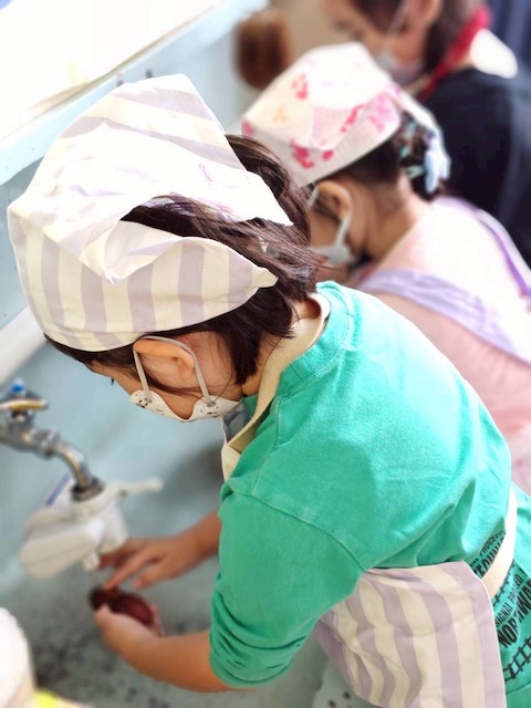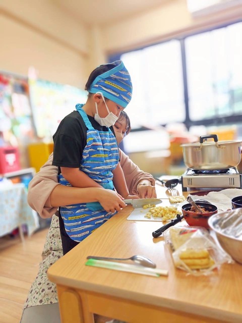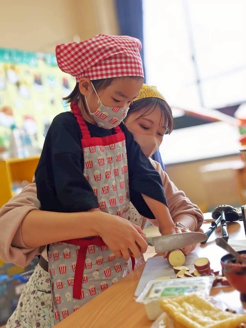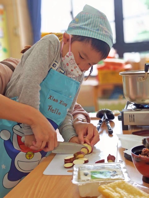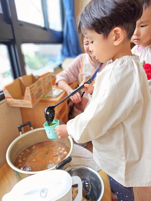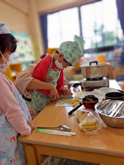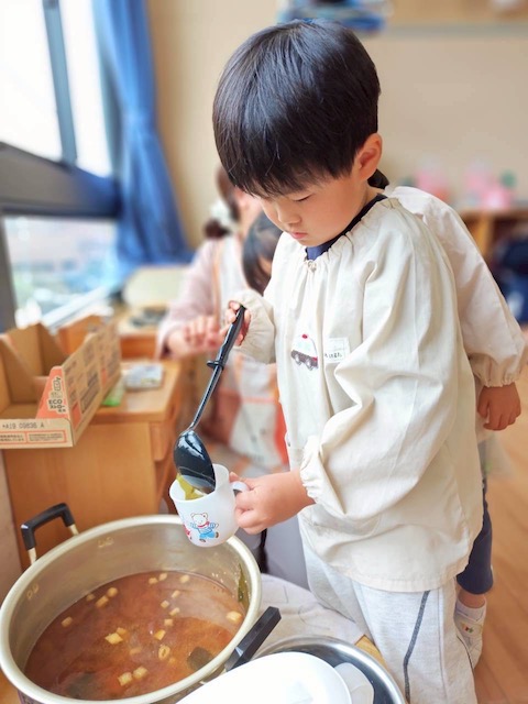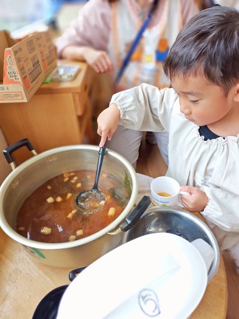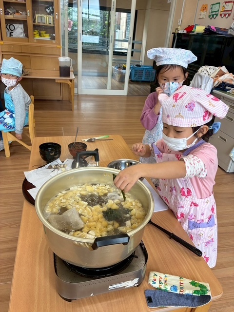 いつも園長先生が作ってくれるお味噌汁、お芋掘りが終わって自分たちで作ってみたい!と年中組。 油揚げやお豆腐もお買い物して作りました!