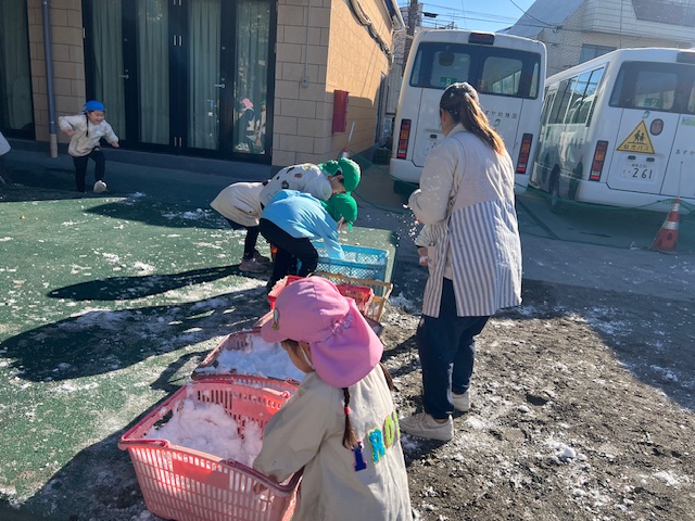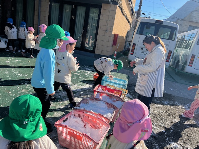 昨日も雪が降りましたがこれは2月の雪の日。 ほぼ朝にはとけていたのですがおじさんたちが雪を集めてカゴに入れてくれました(感謝)